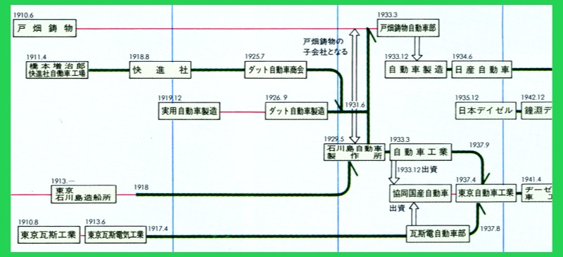 東京と大阪の企業が創り上げた「ダット自動車製造株式会社」が石川島造船と合併し「自動車工業株式会社」を作ります。