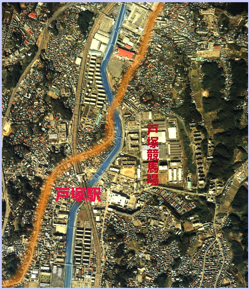現在は汲沢団地横の戸塚高校となっていますが若干その名残(痕跡)が地図上からも確認できます。