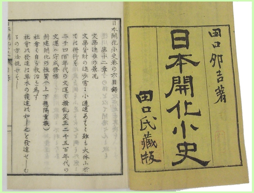 この『日本開化小史』は、田口が睦奥宗光の支援でようやく出版にこぎつけた「自由交易日本経済論」の出版資金つくりのために5年かけて発表したものをまとめたものです。