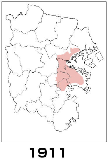 (第1次市域拡張) 1901年(明治34年)4月1日 最初の市域拡大が行われます。 ■武蔵国 久良岐郡 戸太村、中村、本牧村、根岸村 ■武蔵国 橘樹郡(たちばなぐん) 神奈川町、保土ケ谷町大字岡野新田、大字岩間字久保山・大谷・林越・大丸、子安村大字子安を編入します。 (第2次市域拡張) 1911年(明治44年) ■武蔵国 久良岐郡 屏風浦村大字磯子、滝頭、岡 大岡川村大字堀之内、井土ヶ谷、蒔田、下大岡、弘明寺 ■武蔵国 橘樹郡 保土ケ谷町大字岩間字池上・東台・外荒具・道上・塩田・反町・宮下・殿田・関面・久保山下を編入します。